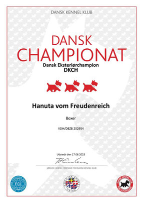 Bei der Doppelausstellung/Jubiläumsausstellung in TaastrupDenmark am 15.06.2025 erreichte Hanuta zweimal ein V1 in einer jeweils gut besetzten Championklasse sowie einmal CK 2.BTK CERT (zweitschönste Hündin) unter Richter Kåre Olesen-Nørklit sowie einmal sogar CK 1.BTK CERT BIM (=BOS) unter Richterin Susanne Ringberg und erfüllt somit alle Anforderungen für den Dänischen Champion!